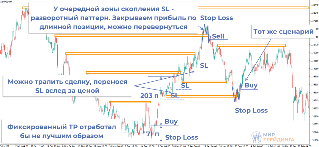 следить за поведением цены в зонах скопления стопов других трейдеров;