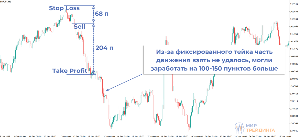 Фиксированный ТР неудобен тем, что не учитывается рыночная ситуация. Движение может быть сильным, и вы возьмете 50-60% от возможной прибыли. Также отработка сценария может оказаться слабой, график не дойдет до тейка, затем развернется и двинется в сторону стоп-лосса. Можно получить убыток вместо небольшого профита. Как правило, фиксированный ТР дает худший результат по сравнению с гибким тейком.