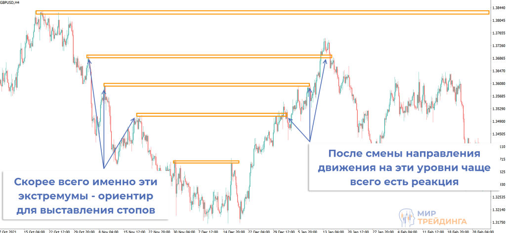 стопы будут выноситься за локальные максимумы. Это удобный ориентир, так поступает подавляющее большинство трейдеров;