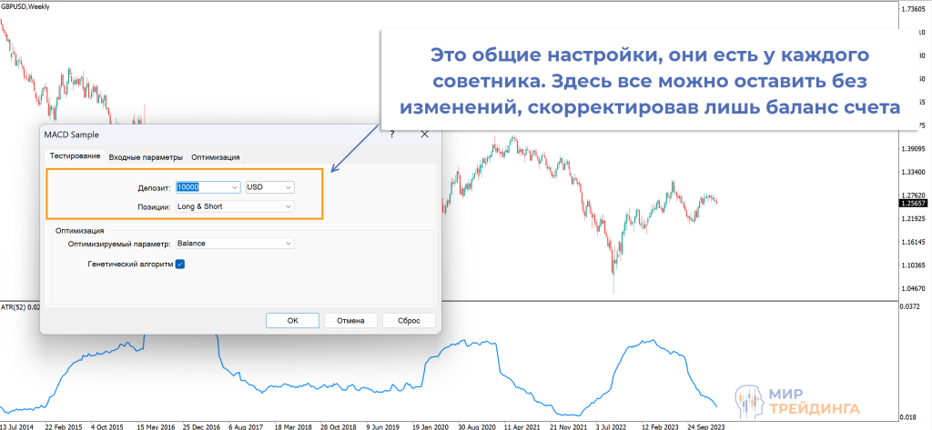 Для перехода в это меню нажмите на «Свойства эксперта» в правом верхнем углу окна тестера. Здесь во вкладке «Тестирование» можно ограничить работу только продажами/покупками или разрешить работать в обе стороны. Также задается валюта и баланс на момент начала тестирования. Все можно оставить по умолчанию, скорректировав лишь баланс.