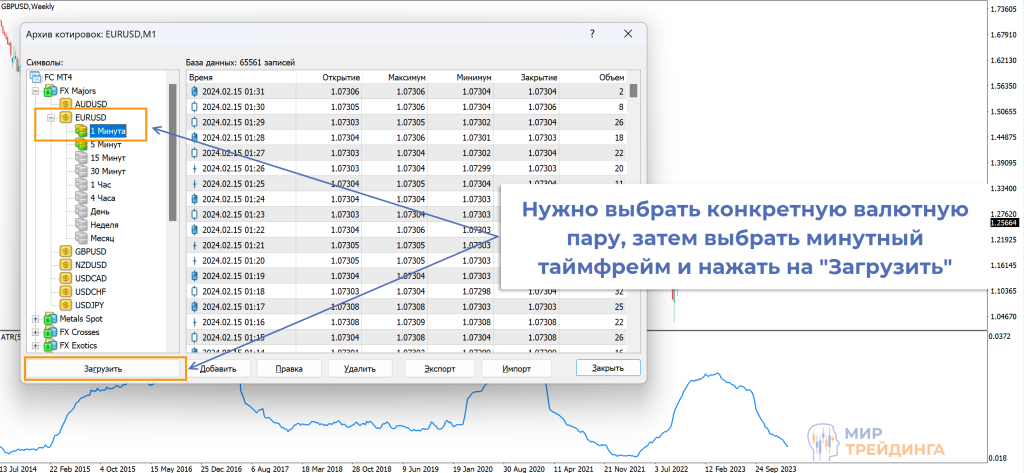 В списке таймфреймов выберите «1 минута» и нажмите на «Загрузить». Начнется загрузка котировок, после ее окончания подготовительный этап завершен.