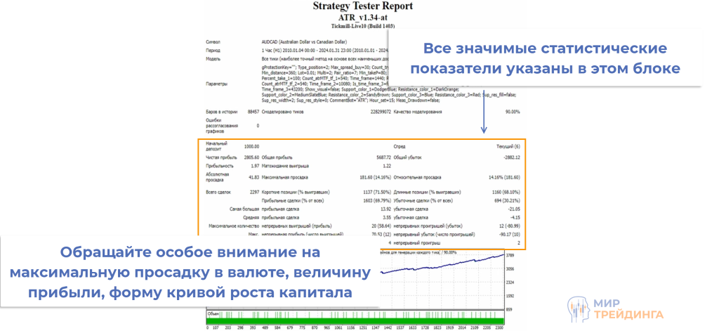 максимальная просадка в валюте – показывает максимальную просадку за все время теста. В нашем случае робот ATR обеспечил просадку на уровне $181,60. На основе этого можно утверждать, что минимальный капитал для этого робота должен составлять порядка $200;