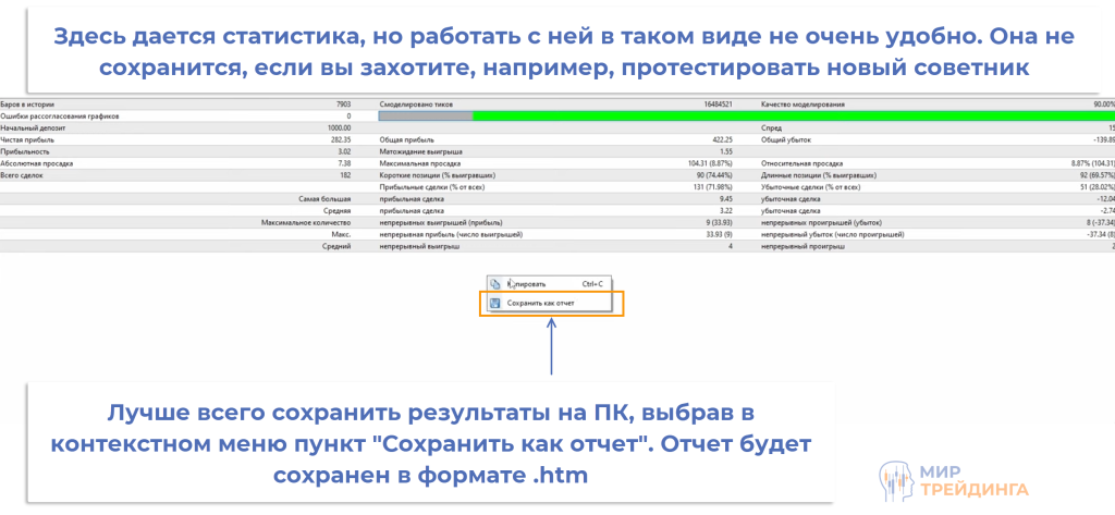 После окончания теста вся статистика и график изменения капитала будет доступен прямо в терминале. Но он не будет храниться постоянно, при тесте следующего робота предыдущая статистика не сохранится.