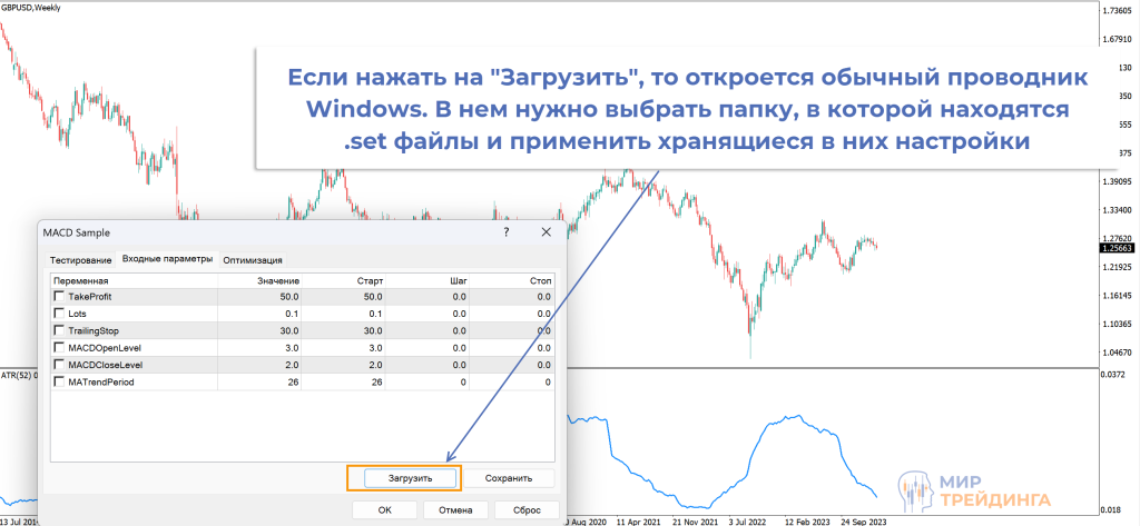 В разделе «Входные параметры» можно задавать произвольные настройки советника. Ключевое здесь – то, что можно загрузить уже готовые параметры из .set файла, они обычно поставляются вместе с советником.