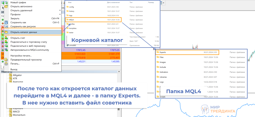 Установка начинается с копирования файла робота, в нашем примере ATR, в директорию Experts. В МТ4 откройте меню «Файл» -> «Открыть каталог данных», откроется проводник, в этой директории найдите папку MQL4, в ней – директорию Experts. Сюда и нужно поместить файл советника.