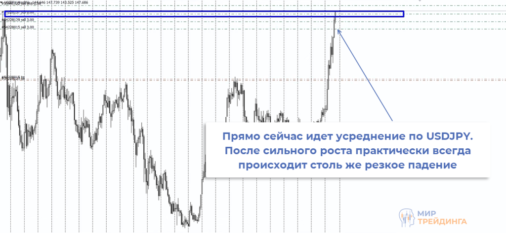 И еще один пример, он еще не отработал. Иена постоянно обновляет исторические минимумы, USDJPY уже прошла больше 4000 пунктов. Открыта серия усредняющих ордеров, при нисходящем движении буду действовать по той же логике, что и в предыдущих примерах.