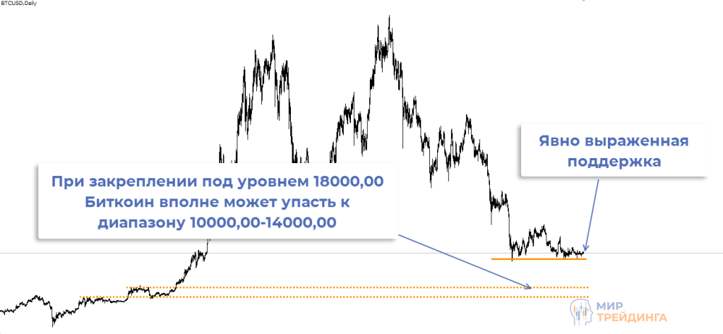Технический анализ подтверждает потенциал снижения Биткоина. Явно видна поддержка на уровне $18000, график прижимается к ней, не исключен пробой. Если это произойдет, то BTCUSD может упасть к следующей поддержке на 14000 и ниже.