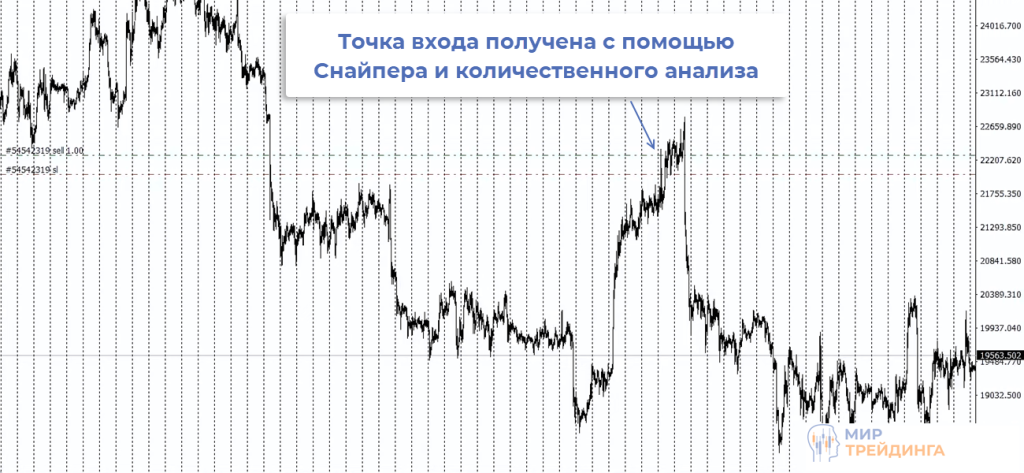 Этот принцип работает на любых активах, в том числе и на криптовалютах. Сделка в примере ниже получена с помощью Снайпера и количественного анализа. Как и в случае с AUDUSD большая часть объема закрыта по тейк-профиту.