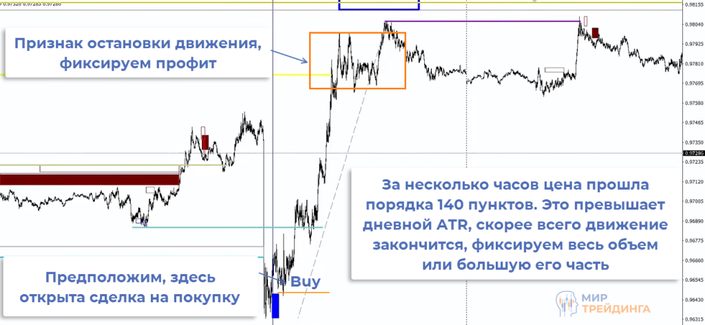 Дневной ATR позволяет понять сколько в пунктах в среднем за день проходит валютная пара. Если, например, EURUSD проходит за день 130 пунктов и пара уже прошла 100, то есть смысл закрывать сделку или зафиксировать хотя бы часть объема.
