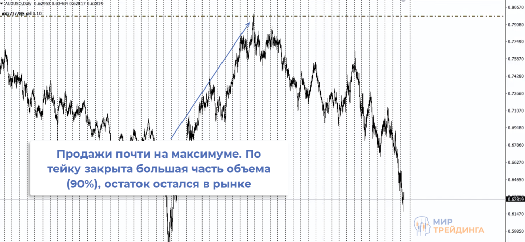Но анализ старших таймфреймов показывал, что потенциал движения пары куда больше. В момент продаж AUDUSD была на 6-летнем максимуме. По оставшейся части объема прибыль уже превысила 1700 пунктов.