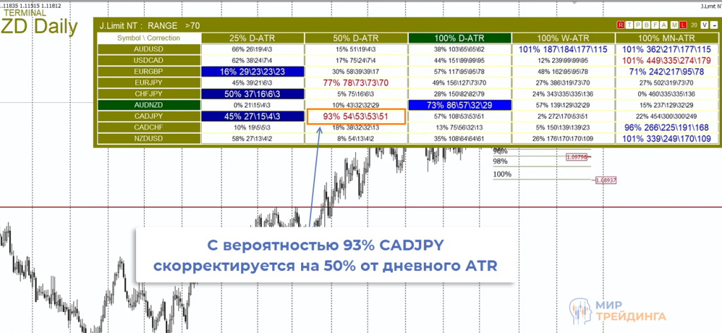 В примере индикатор сообщает о 93%-ной вероятности коррекции на 50% от дневного ATR. Если по CADJPY открывались сделки, то нужно соотнести их с этими показаниями.