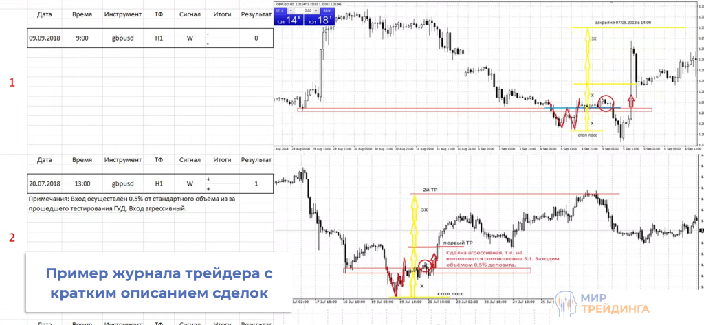 внесение сделки в дневник трейдера. В идеале нужно не просто указывать технические детали, но и прикреплять рисунок графика с разметкой.