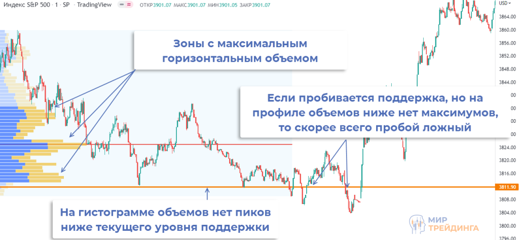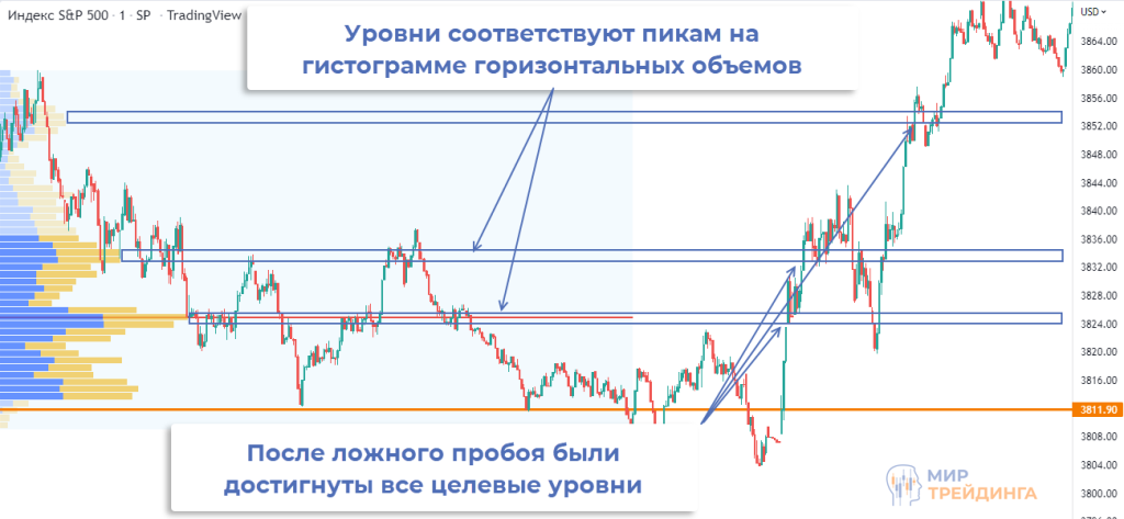 В примере произошло именно это — трижды график S&P 500 пытался пробить поддержку. Но ниже не было максимумов на гистограмме профиля рынка, в итоге эти движения оказались ловушкой. Уже после второй неудачной попытки пробоя можно было говорить, что пробоя не будет.