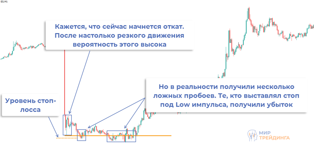 Трейдер мог открыть сделку на покупку и вынести SL под минимум импульсного движения, но позже график несколько раз пробивает поддержку и буквально на несколько пунктов опускается ниже уровня стоп-лосса.