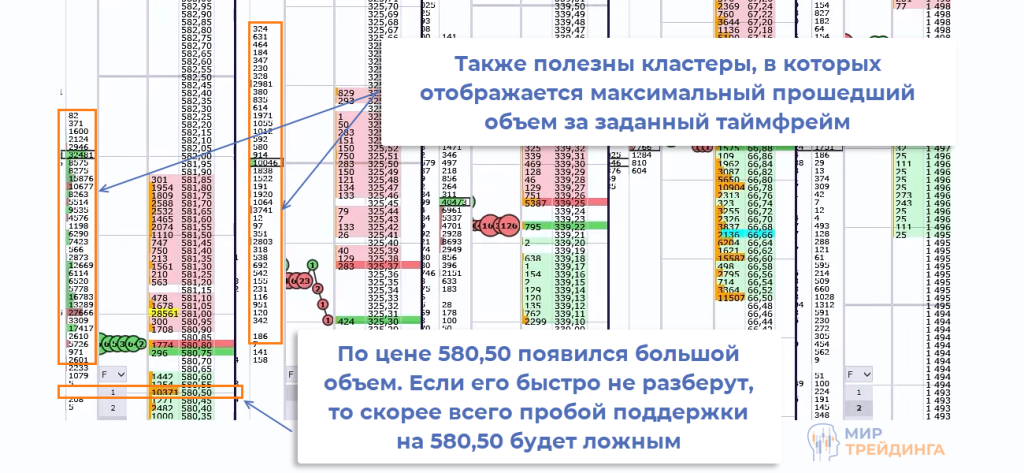 В верхней части (красный цвет) — заявки на продажу, в нижней (зеленый цвет) — на покупку. Если в момент пробоя поддержки возникает, например, большой объем на покупку и его долго разбирают, то, скорее всего, пробой ложный. Также помогает кластер в левой части. В нем отображается максимальный объем, прошедший за таймфрейм кластера.