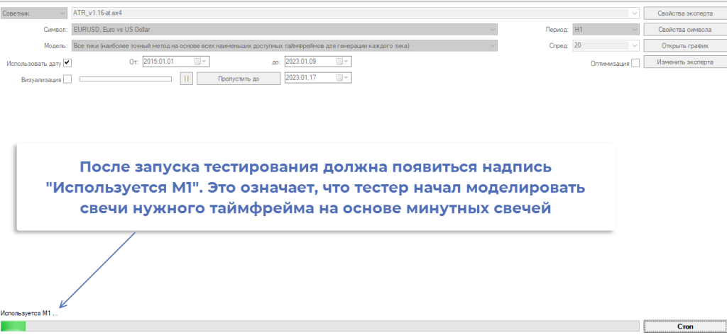 Вернитесь в тестер и нажмите на «Старт». В левом нижнем углу должна появиться надпись «Используется М1», тестер начал использовать загруженные на предыдущем этапе котировки. В результате теста получите точность в 90%.