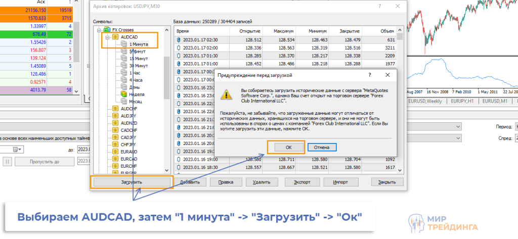 нажмите на «Загрузить» и согласитесь с предупреждение о загрузке котировок с сервера MetaQuotes.
