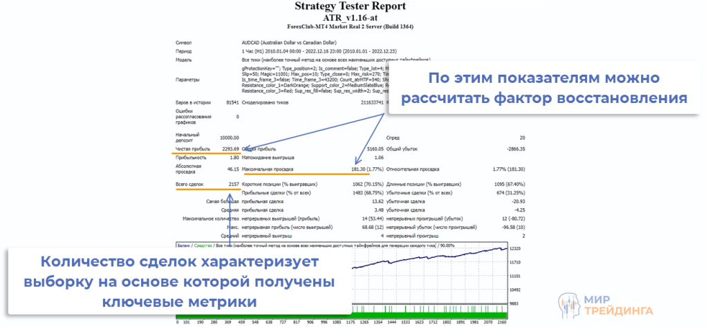 фактор восстановления, рассчитывается как отношение чистой прибыли к максимальной просадке. В примере он равен 12,65 – это отличный результат;
