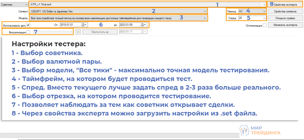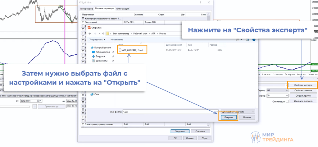 Также перед началом тестирования нужно загрузить настройки из .set файла. Нажмите на «Свойства эксперта», затем – «Загрузить» и выберите расположение файла с настройками. Параметры советника должны измениться после применения настроек.