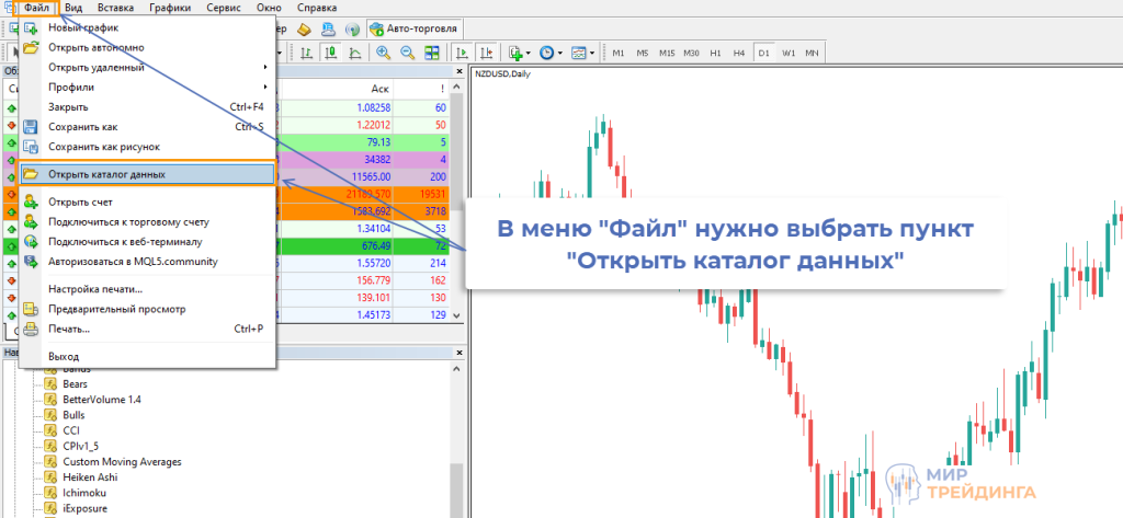 в терминале перейдите в «Файл», затем – «Открыть каталог данных»;
