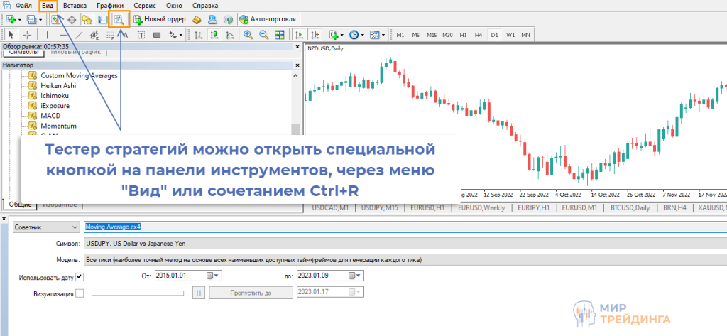 Далее переходим в тестер стратегий. Это можно сделать сочетанием Ctrl+R, нажать на значок лупы в панели инструментов либо перейти в него через меню «Вид». Удобнее всего использовать сочетания клавиш для ускорения работы с терминалом.