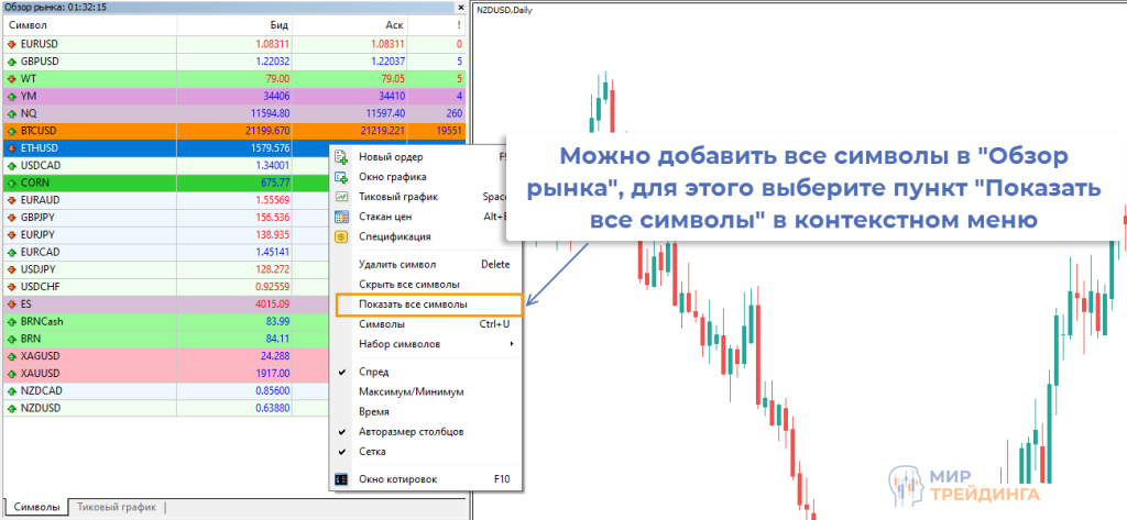 выбрать валютную пару. Мы уже знаем, что под ATR есть сет настроек под AUDCAD, выбираем соответствующий актив. Здесь доступны только инструменты, отображающиеся в окне «Обзор рынка». Если нужного актива нет, то можно либо выбрать пункт «Показать все символы» в «Обзоре рынка», либо перейти в меню «Символы» (Ctrl+U) и вручную добавить нужные инструменты;
