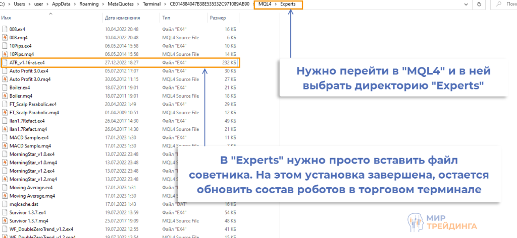 вставьте в нее файл советника. В нашем примере используется свежий авторский робот ATR;