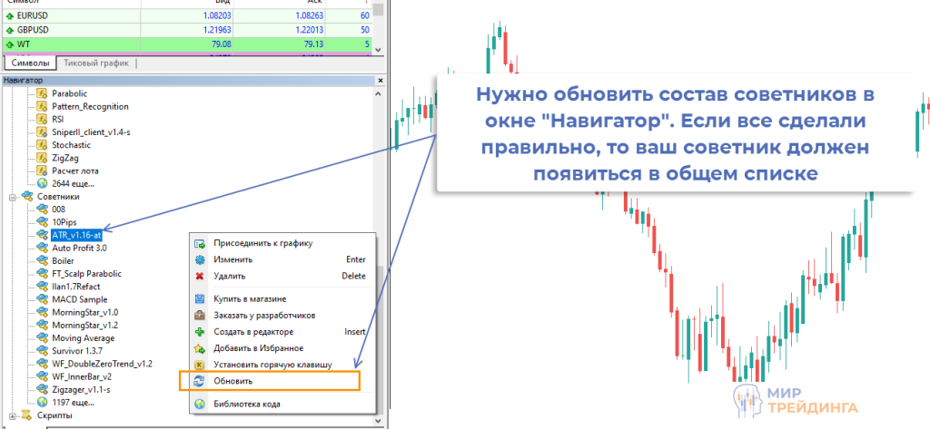вернитесь в терминал и либо перезагрузите его, либо обновите состав роботов в окне «Навигатор». Для этого откройте список советников, нажмите правой кнопкой мыши на любом из них и выберите «Обновить».