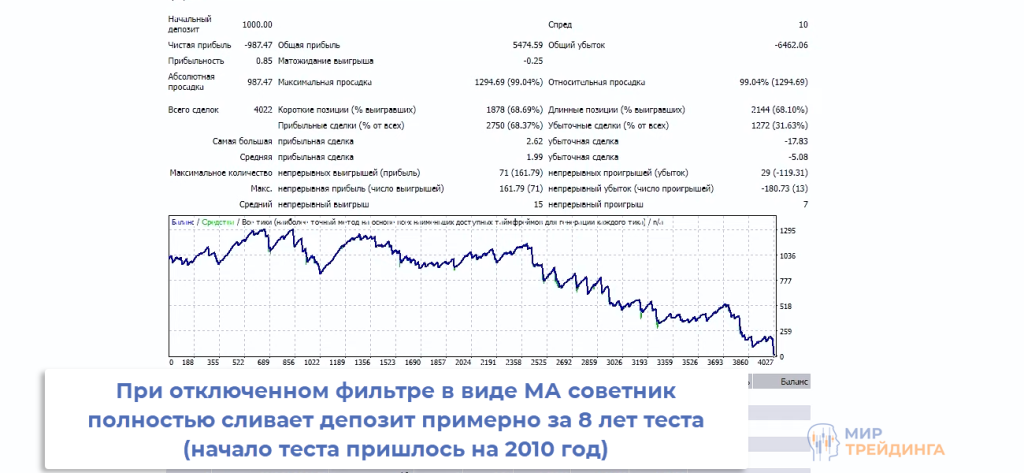 Всю серьезность ситуации показывает тестер. Если отключить МА, то SmartTrend превращается в сливающего робота. Тест проводится с 2010 г., но примерно на восьмом году тестирования депозит оказался слит.