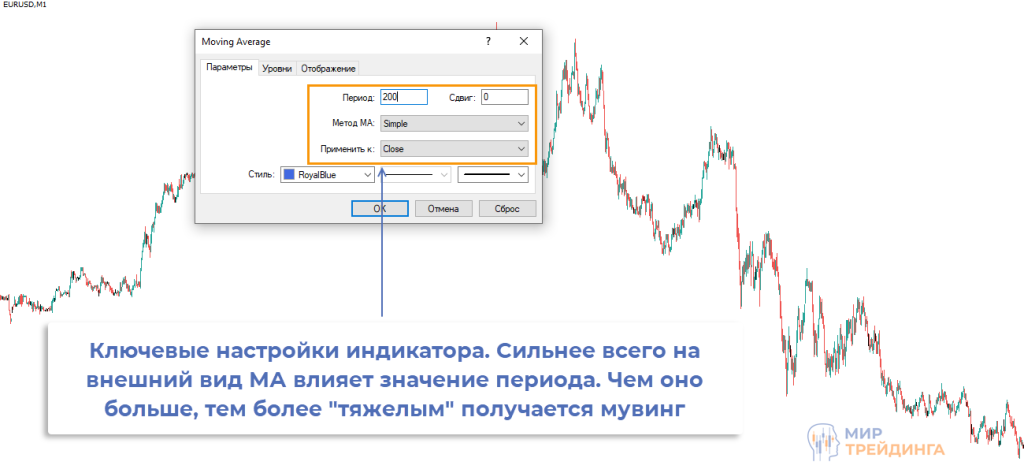 применить к – по какому типу цены будет рассчитываться МА. Обычно используют Close.