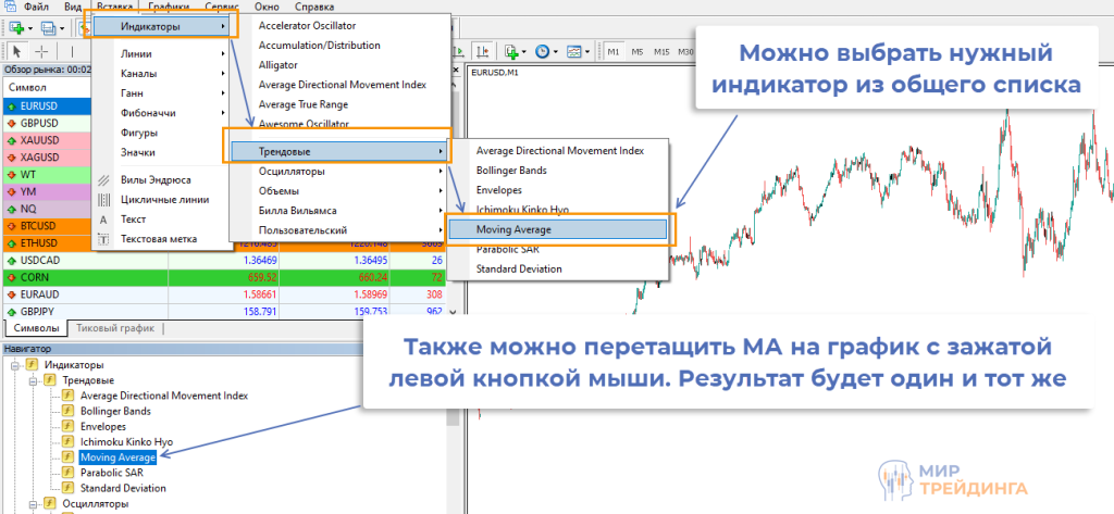 с зажатой левой кнопкой мыши МА перетаскивается из панели «Навигатор» на график нужного торгового инструмента.