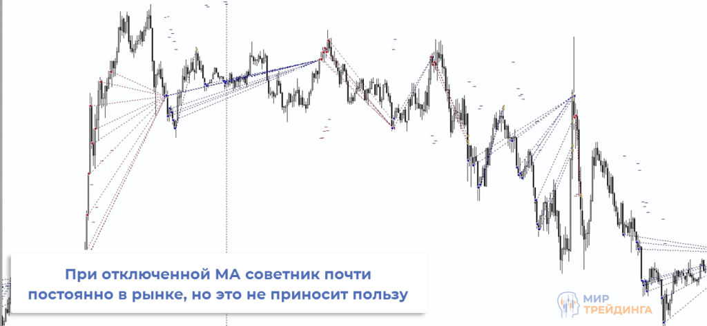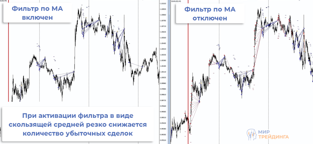Если сравнить один и тот же участок графика с отключенным и включенным фильтрами по МА, то видно насколько значима роль мувинга. Он буквально отсекает большую часть убыточных сделок.