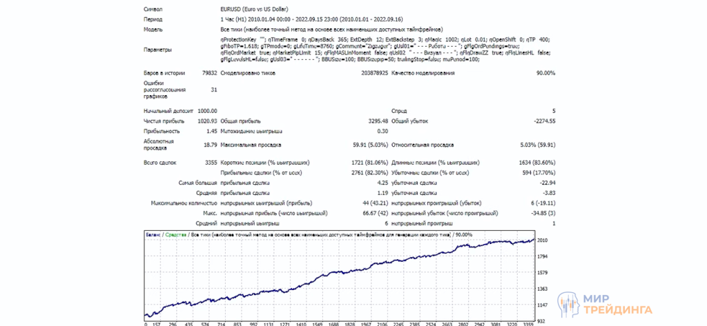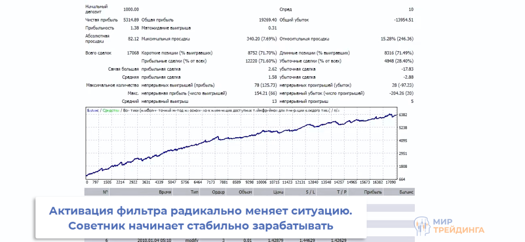 Это влияет на и результаты тестирования. Если при деактивированном фильтре по МА депозит стабильно сливался, то при активной фильтрации точек входа SmartTrend зарабатывает. Кривая изменения депозита стабильно растет и нет затяжных периодов стагнации.