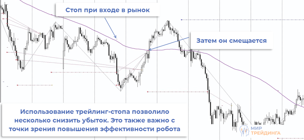 линия скользящей средней – ориентир для выставления стоп-лосса. Также линия МА используется для трейлинг-стопа, то есть после открытия сделки стоп тралится, переносится по мувингу. Это снижает возможный убыток и в целом делает торговлю безопаснее.