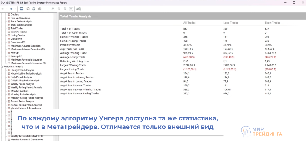 используется та же статистика для анализа результатов. Из-за того, что работа ведется на срочном рынке отличается внешний вид, но в остальном применяются те же метрики для оценки результатов. Это продолжительность периода стагнации, максимальная просадка в валюте/процентах, фактор восстановления, максимальный убыток, винрейт и прочие показатели,