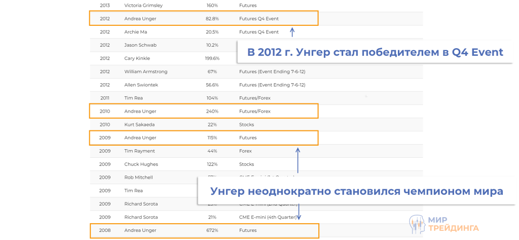 Но куда интереснее его результаты на World Cup Trading Championship. Турнир проводится в течение всего года, так что случайная победа исключена. Никто не сможет работать наугад в течение года и стабильно зарабатывать.