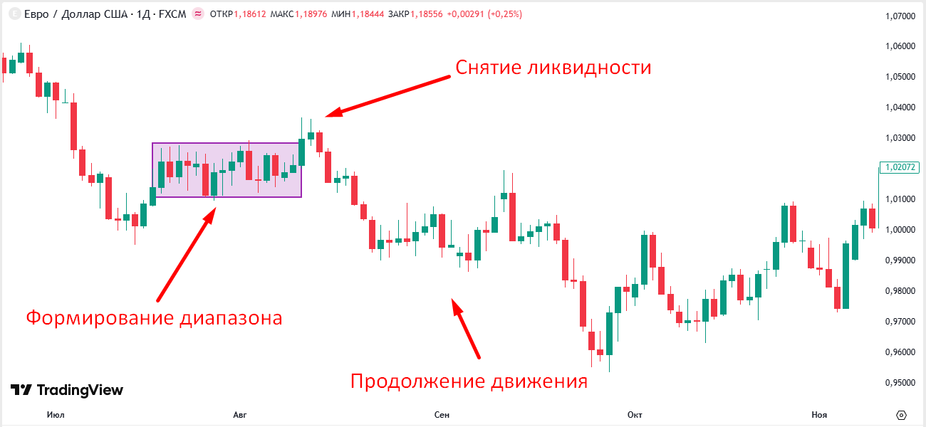 На крупных масштабах формируются фазы накопления и распределения. Именно здесь “умные деньги” набирают или разгружают позиции. На этих уровнях рынок может двигаться боком, создавая иллюзию неопределенности, но внутри этого диапазона идет активная работа крупных игроков.