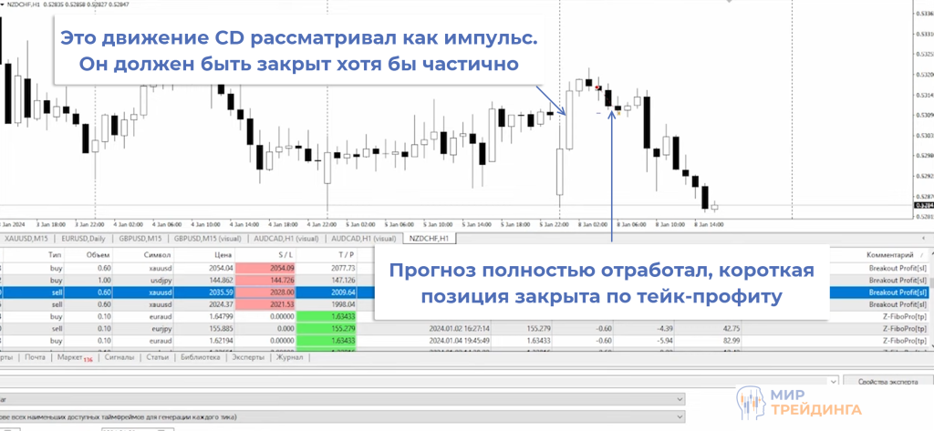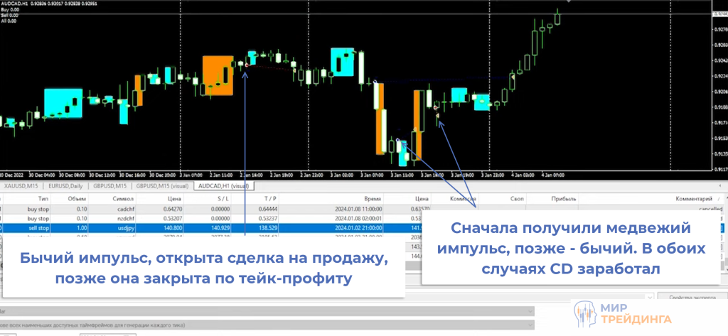 На реальном рынке советник работает точно так же, как в тестере. В настройках задаются параметры импульса, затем CD находит его на графике и, при условии появления разворотной свечи, открывает сделку в расчете на коррекцию.
