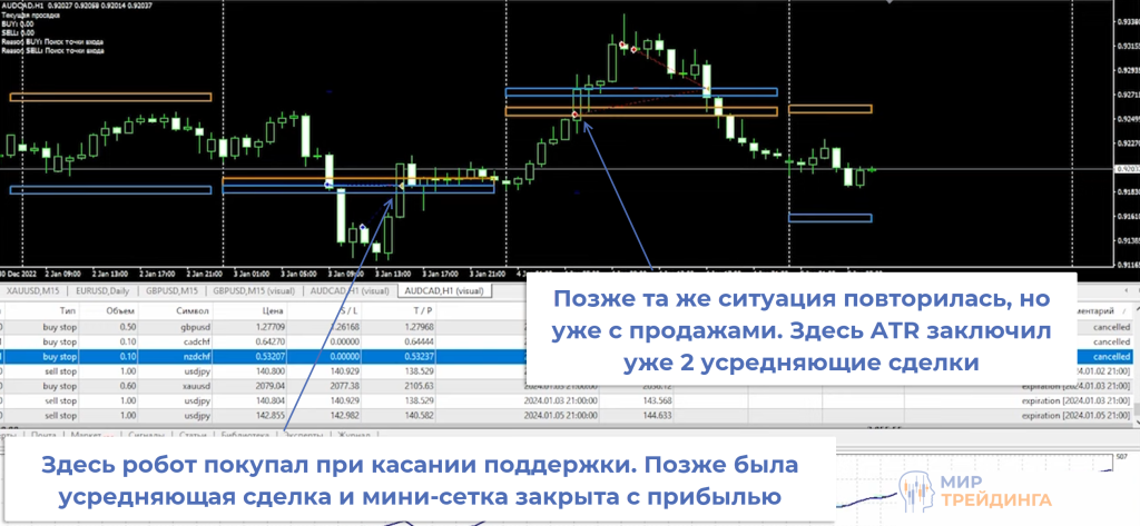 В примере выше первая сделка открывалась при касании голубого прямоугольника – это нижняя граница диапазона дневной волатильности. Робот считает, что во флете эта поддержка не будет пробита и более вероятен отбой от уровня, чего его пробой.