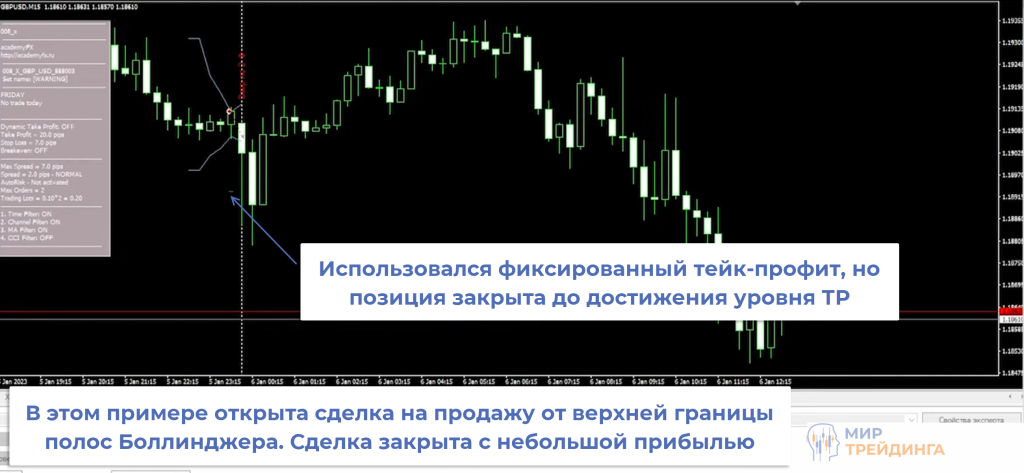 В 008 используется эта особенность – робот ищет точки входа при отбое от границы полос Боллинджера. Формально скальпер может выставлять фиксированный тейк-профит и стоп-лосс, но большая часть сделок будет закрываться с недоходом до него. В логике сделан акцент на надежности, лучше взять чуть меньший профит, чем рисковать и в итоге лишиться всей прибыли по сделке.