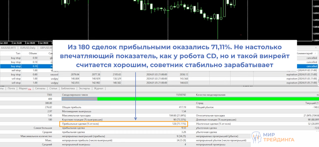Тест за год показывает, что советник работает с винрейтом около 70%, это хороший показатель. Средняя прибыльная сделка составила $3,26, средний убыток – $2,70, с учетом этого и того, что с прибылью закрывается 7 сделок из 10 становится понятным, что ATR не может слить капитал трейдера.