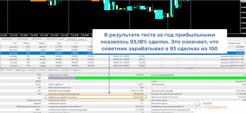 При тесте за год по одной валютной паре советник заключил более 200 сделок. С прибылью закрыто более 90% сделок, этот робот включен в наш портфель и показывает схожие результаты.