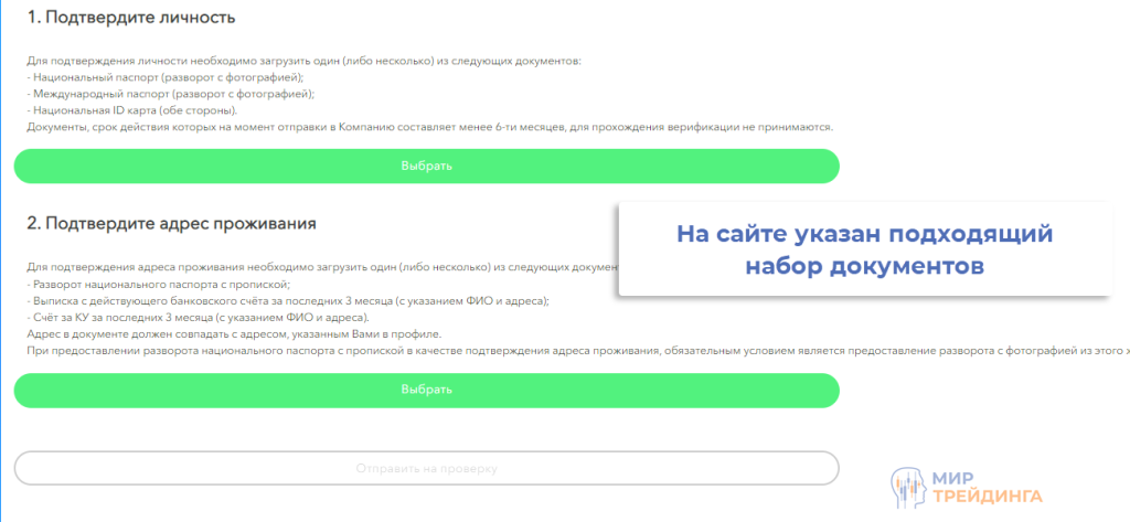 После регистрации желательно сразу же пройти верификацию, отправив сканы нужных документов. Отдельно подтверждается личность и адрес проживания, соответствующий раздел есть во вкладке «Мой профиль» в личном кабинете. Торговать можно и до завершения верификации. Это скорее страховка, чтобы в будущем не возникла досадная задержка.