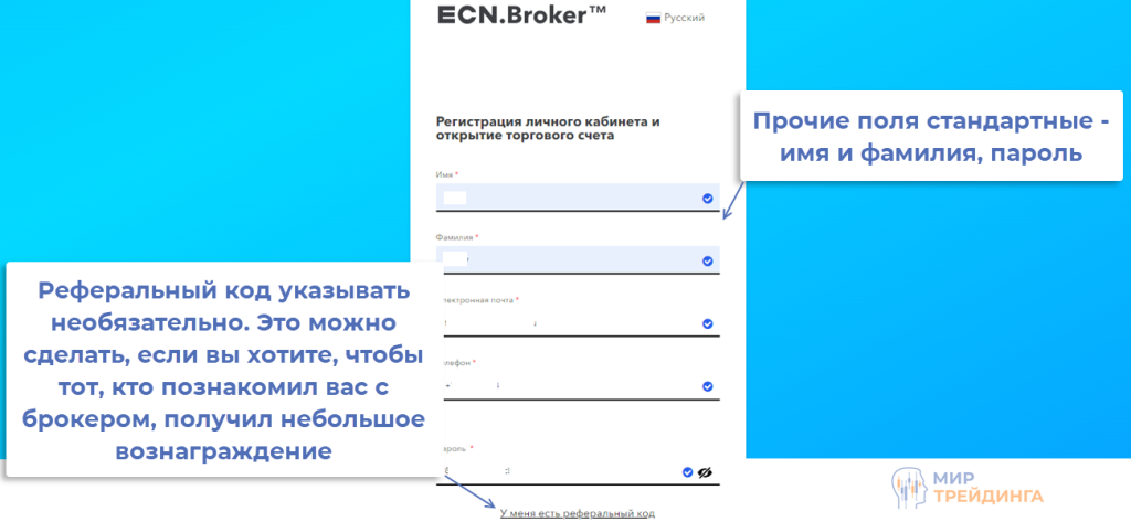 появится регистрационная форма. В ней указывается имя, фамилия, номер телефона и пароль. Реферальный код – аналог партнерской ссылки, на регистрацию не влияет. Его можно указать, если вы хотите стать чьим-то рефералом. На вас это никак не скажется, но тот, кто познакомил вас с ECN.Broker, получит поощрение от брокера. Остается нажать на «Открыть счет»;
