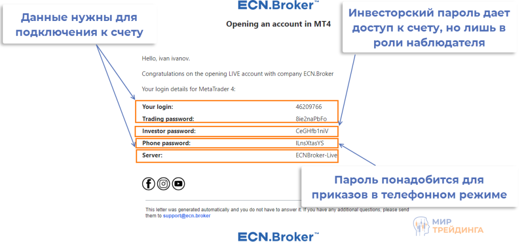 на почту приходит 2 письма. В одном брокер поздравляет с регистрацией, в тексте найдете ссылки на все важные разделы в личном кабинете. Здесь есть ссылки на раздел с верификацией, пополнением счета, есть и ссылка загрузку торговой платформы (используется МетаТрейдер4). Во втором – данные для подключения к счету, инвесторский пароль и пароль для отправки заявок в телефонном режиме.