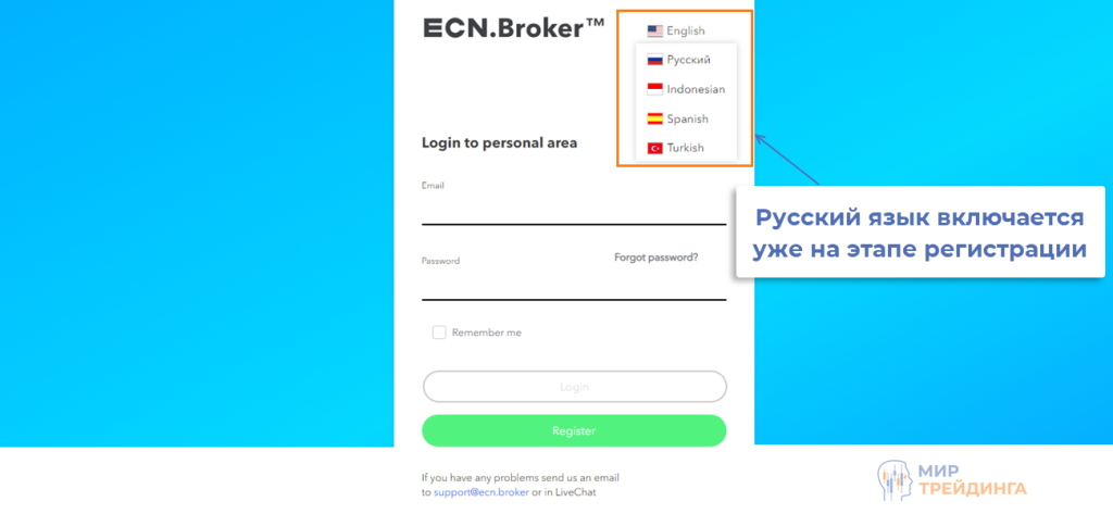 На главной странице сайта ECN.Broker в меню выбора варианта локализации нет русского языка. Но его можно включить уже на этапе заполнения регистрационной формы. После входа на официальный сайт: