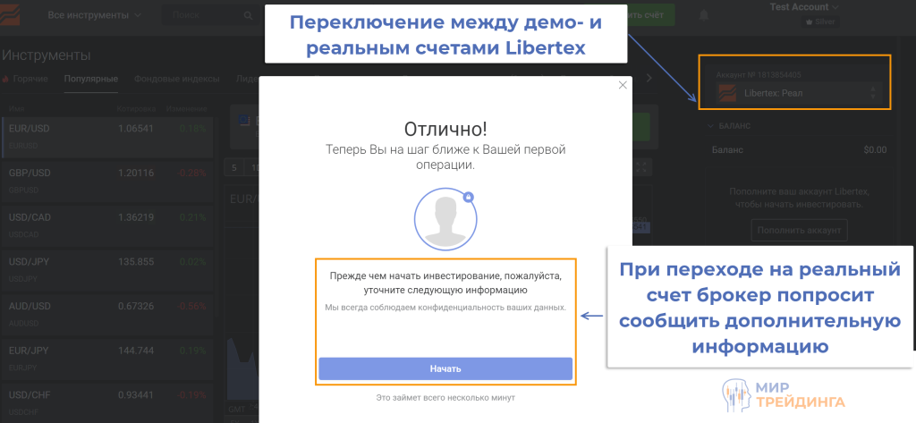 В правом верхнем углу есть переключатель между демо- и реальным счетами. Если переключиться на реальный счет, то брокер попросит указать дополнительную информацию.