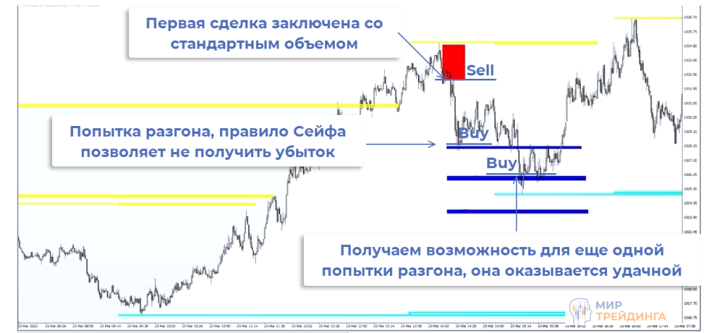 рабочий объем делим на 2 равные части. Если стандартный объем – 0,5 лота, то при использовании Сейфа вход в рынок выполняется 2 сделками по 0,25 лота;