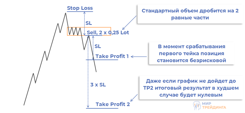 ТР по оставшейся половине объема выносится на 3 х SL от точки входа в рынок.