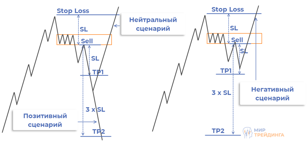 позитивный сценарий предполагает продолжение движения в нужном направлении и после первого срабатывает второй ТР. Из-за правила Сейфа недобираем незначительную часть профита.